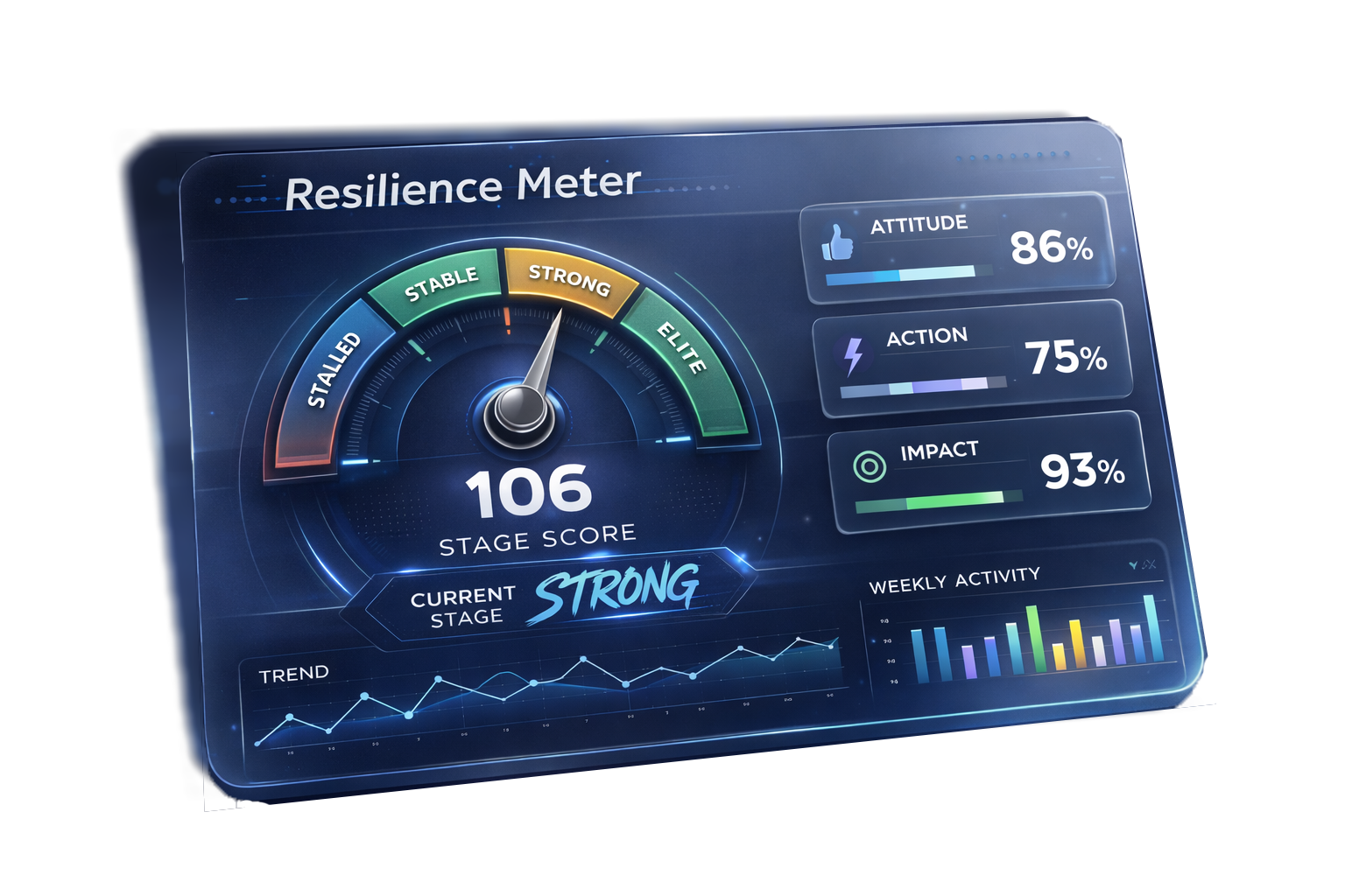 Clarity about where you stand. A proprietary resilience and culture assessment that helps individuals visualize where they stand — and gives organizations anonymous insight into Team's Self-Awareness, Culture, and Structure.
